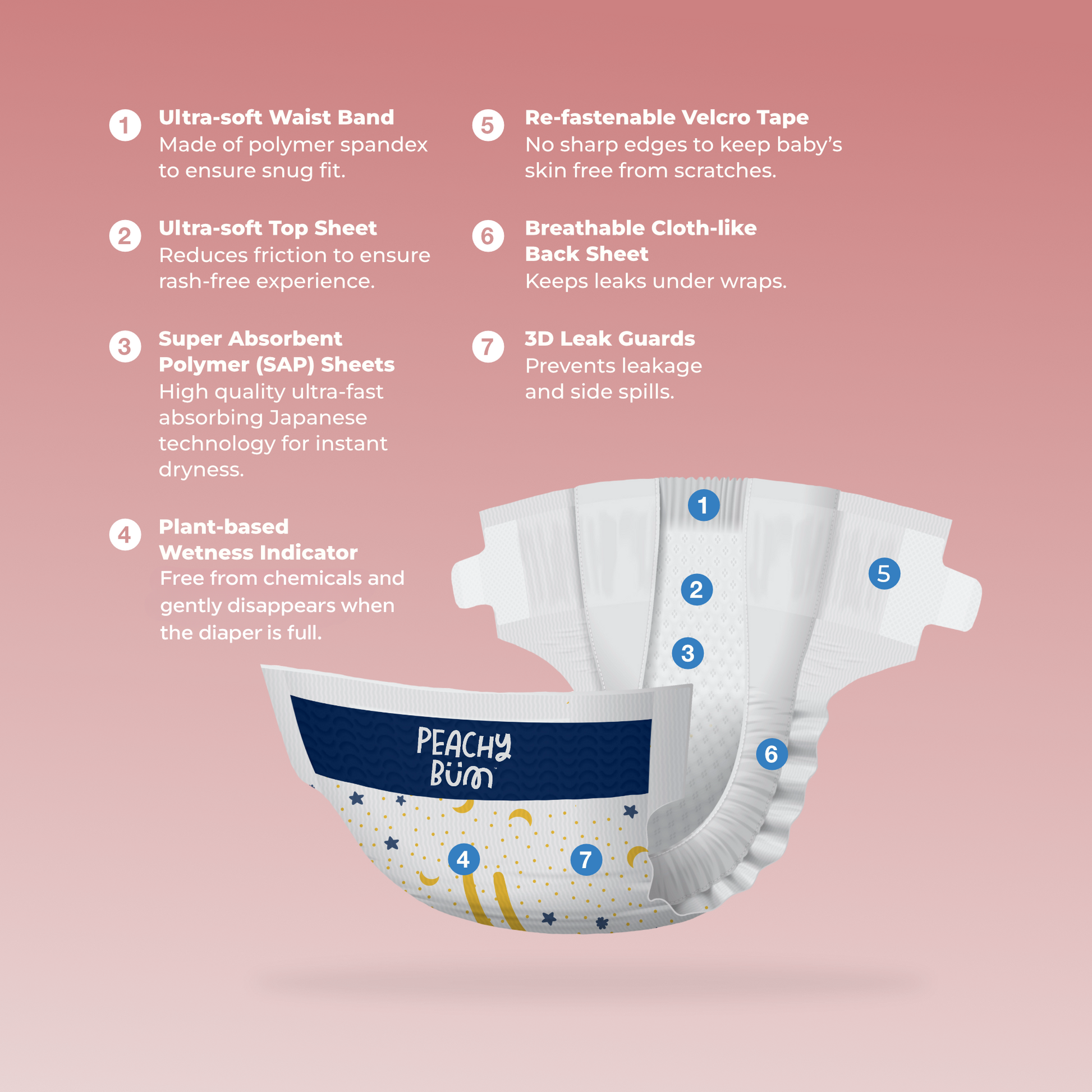 Absorbent Pad: Our super-absorbent polymer (SAP) and non-woven magic duo soak up all the mess, keeping your little peach dry.